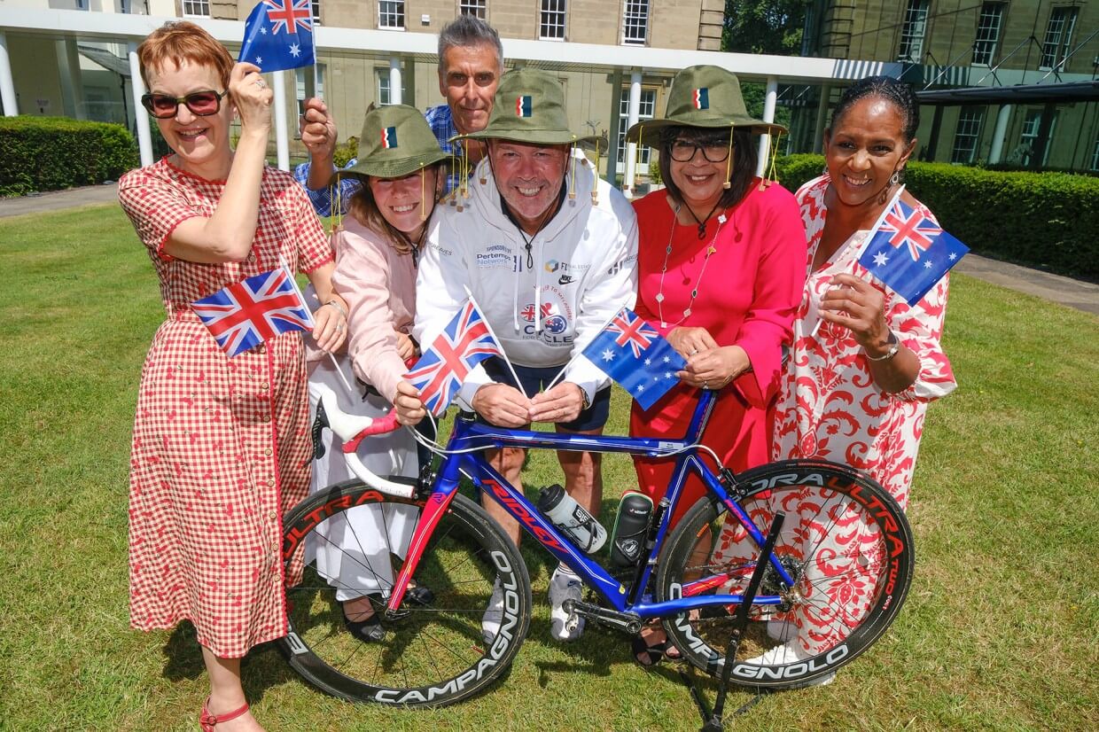 A charity cyclist who rode more than 9,000 miles from the UK to Australia to raise money for good causes is back on home soil – and dropped in to thank a local backer.
